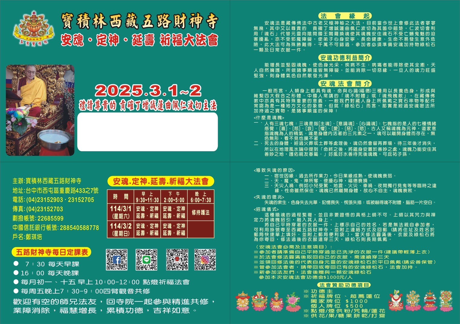 寺廟僧眾日常以法行事業為主,如供養護法、煙供、儀軌修法等等,利益在世與往生者;並且迎請不同教派活佛,每年舉行大樂品願法會,助其千萬民眾接受如意妙法。目前活佛為了臺灣寶島眾生,興建了臺中寶積林西藏五路財神寺。